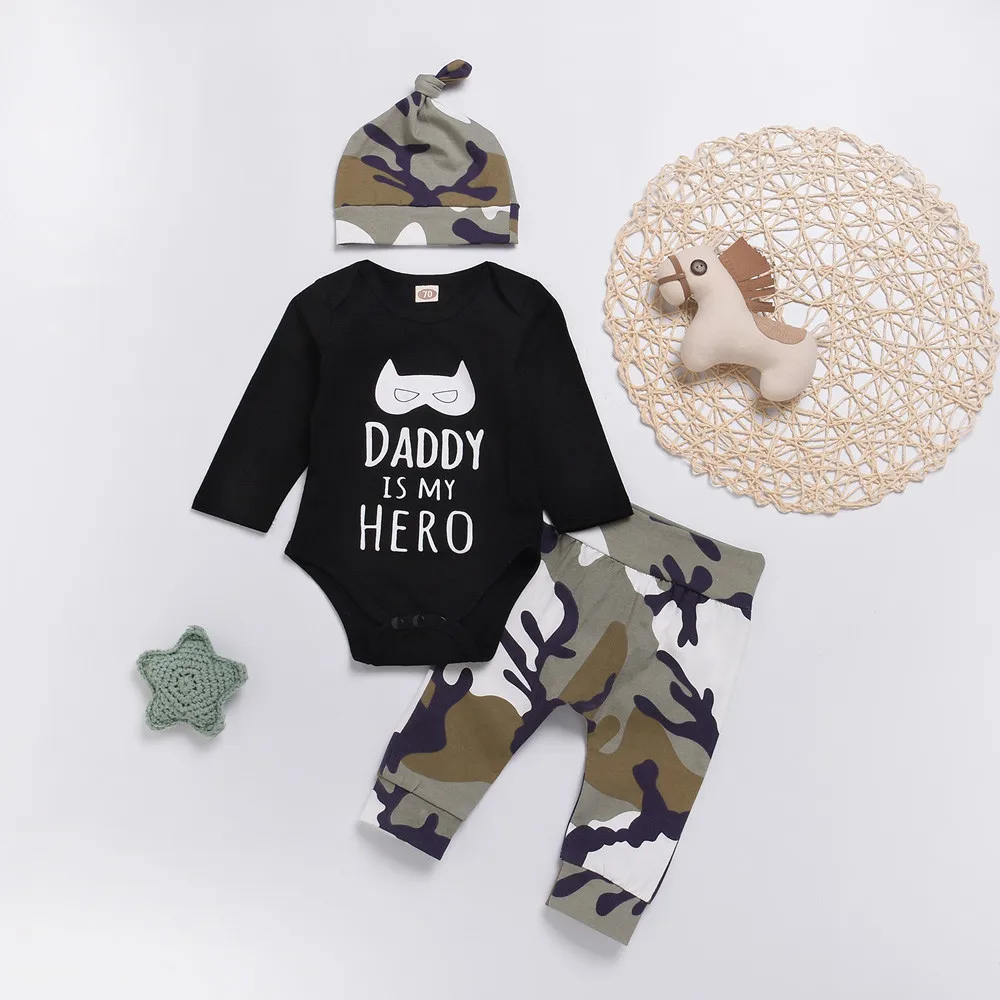 3pcs Newborn Toddler Baby Boy Girl Camo Long Sleeve Letter Printed Romper Tops Camouflage Pants Legging Hat Outfits Set Clothes