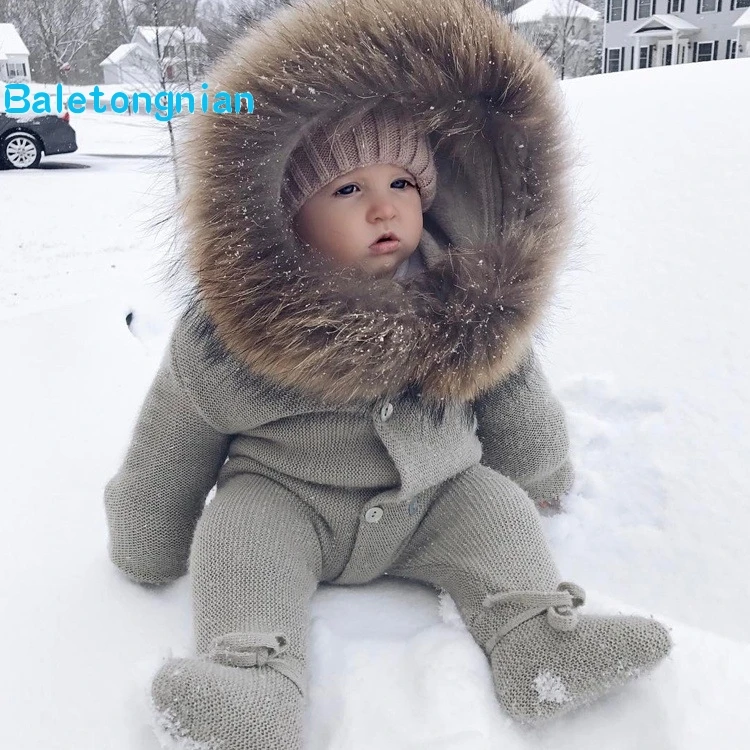 Us 8 55 25 Off Infant Baby Rompers Winter Clothes Newborn Baby Boy Girl Knitted Sweater Jumpsuit Warm Fur Hooded Kid Toddler Outerwear R18 In