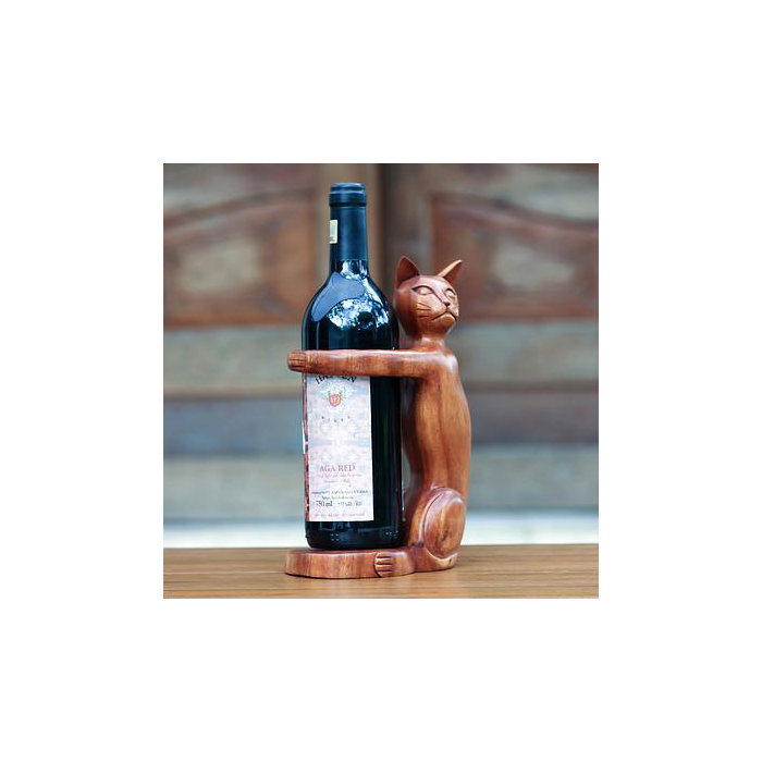 Hand Carved Wooden Cat 1 Bottle Tabletop Wine Bottle Rack