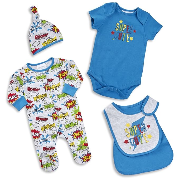Babytown Newborn Baby Boy Superhero Comic Themed 4 Piece Sleeper Set
