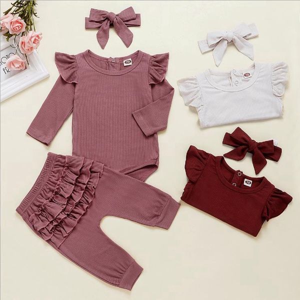 2019 Baby Girl Clothes Infant Girls Flying Sleeve Rompers Ruffle Pants Headband Sets Solid Newborn Outfits Boutique Baby Clothing Dw4860 From
