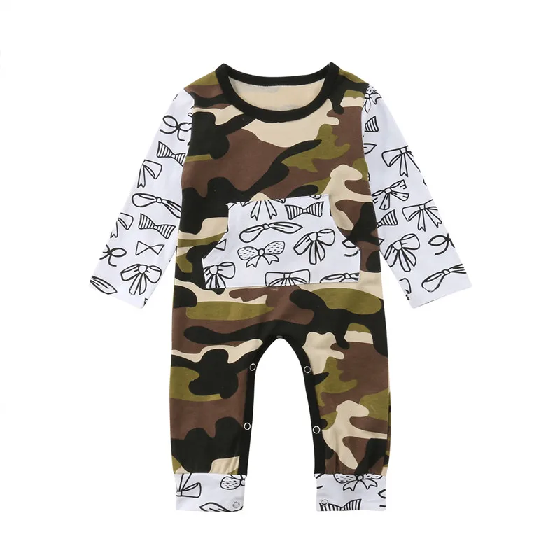 Us 5 41 45 Off Newborn Baby Girl Boy Camo Clothes 0 24m Sweet Girls Boys Long Sleeve Jumpsuit Bowknot Printed Romper With Pocket Outfit Sunsuit In