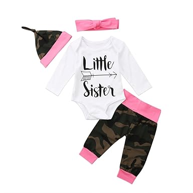 Infant Newborn Baby Girls Little Sister Bodysuit Camouflage Pants With Headband And Hat Outfit