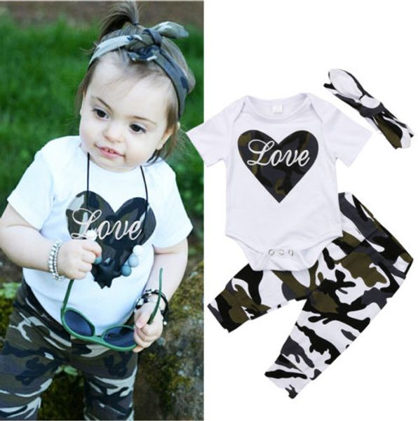 2019 Fshion Baby Girl Camouflage Love Romper Pants Headband Outfits Set Clothes Heart Kid Girl Boutique Clothing Summer Toddler 0 24m From Tyfactory