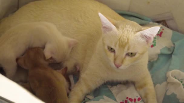 Brown Mother Cat Feeding Her Newborn Four Cute Kittens