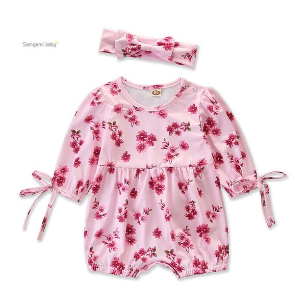 2019 Newborn Baby Girl Rompers Infant Girl Designer Clothes Onesies Girls Long Sleeve Bow Little Floral Cuffs Tie Jumpsuit With Headband 3 24m From