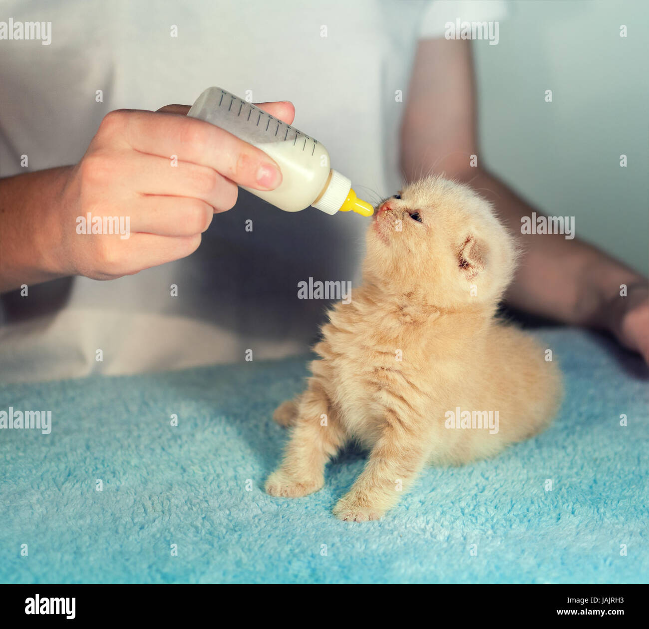 Feeding Little Newborn Kitten With Milk Replacer Stock Photo