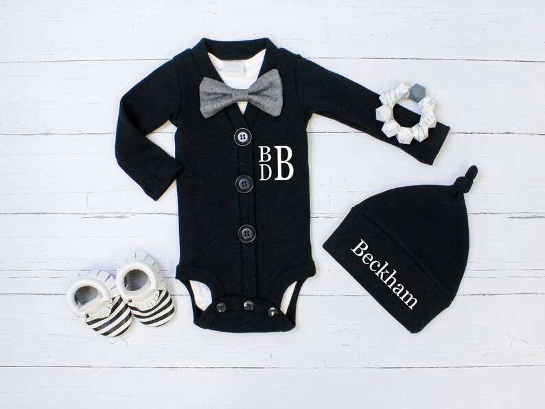Black Monogrammed Baby Boy Clothes Newborn Boy Going Home Outfit Coming Home Outfit Monochrome Name Hat Personalized Cardigan Preppy