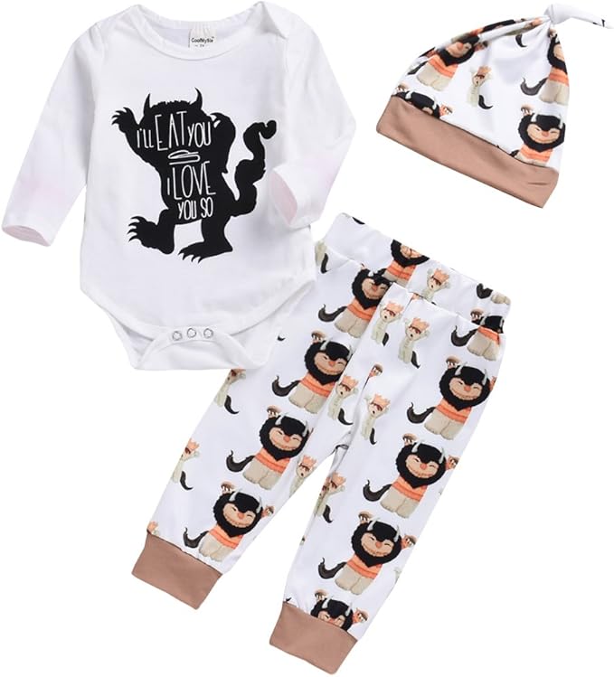 Newborn Baby Boy Wild Monster Cartoon Letter Jumpsuit Tops Pants Clothes Set