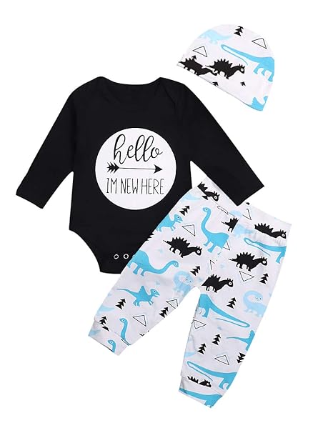 Baby Boy Clothes Hello Im New Here Letter Print Romper Dinosaur Pattern Long Pants Hat 3pcs Outfits Set
