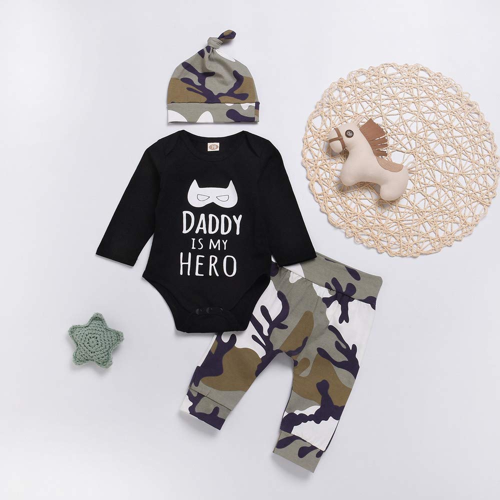 Kacakid 3pcs Newborn Baby Boys Cute Letter Printed Romper Camouflage Pants Hat Outfits Set