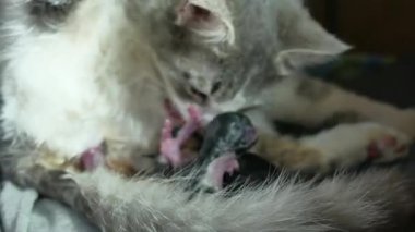 Mother Fluffy Cat Pregnant Give Birth And Newborn Baby