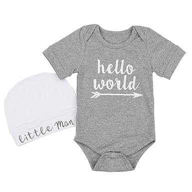 Newborn Baby Boy Clothes Hello World Letter Print Romper Bodysuit Hat 2pcs Outfit Sets