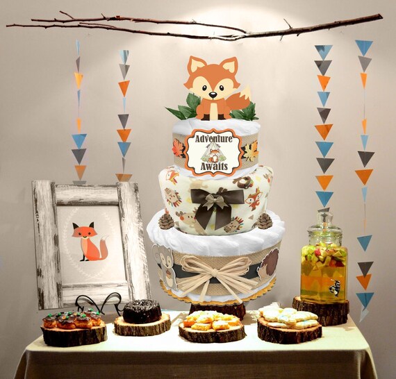Woodland Creatures Adventure Awaits Diaper Cake Customize Baby Shower Gift Gender Neutral Gender Reveal Fox