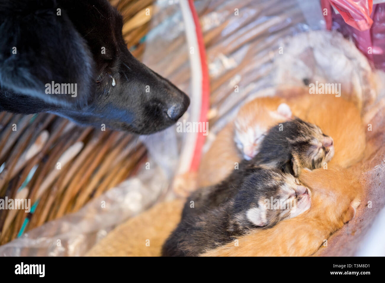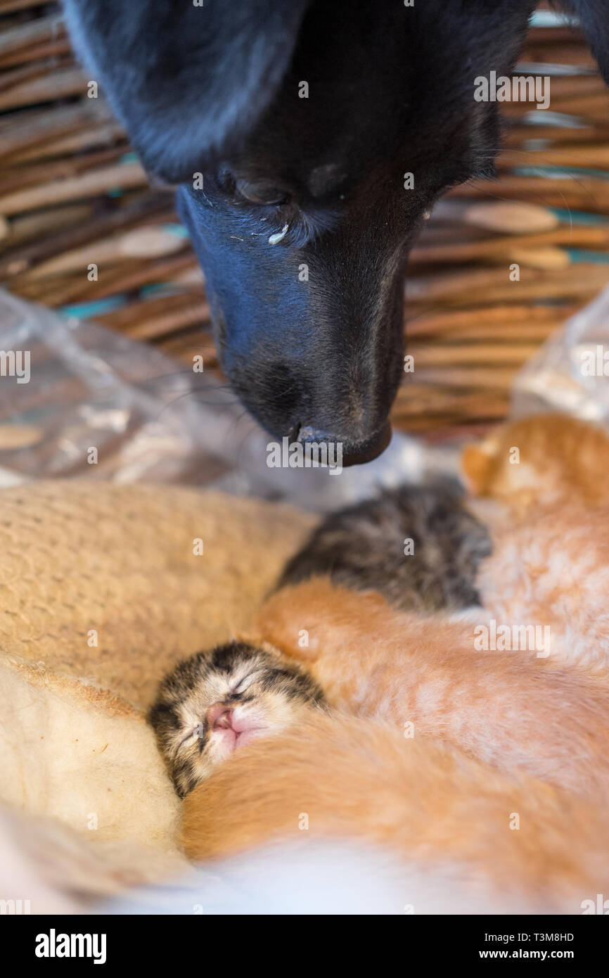 Black Dog Looking At Sleepy Newborn Kittens Stock Photo