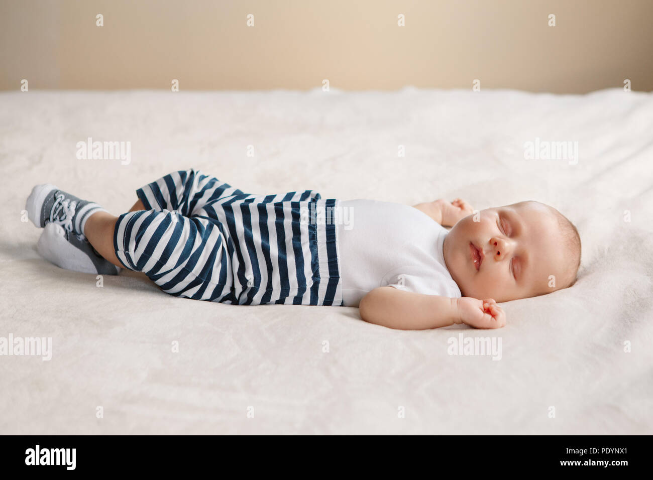 Beautiful Newborn Baby Girl Sleeping In Bed Stock Photo