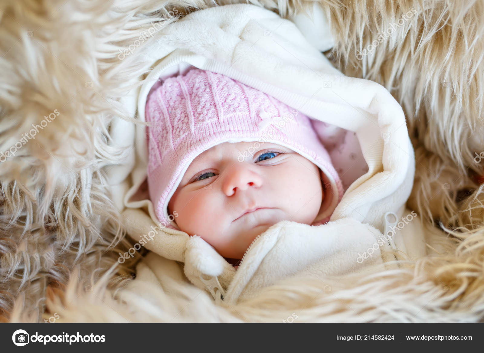 Cute Two Weeks Old Newborn Baby Girl Wearing Soft Pink Knit