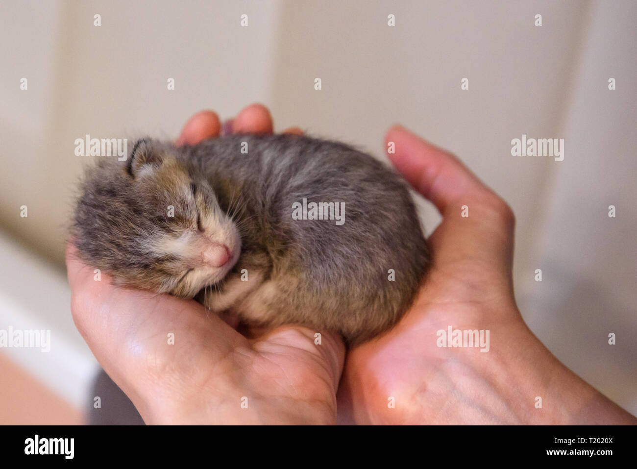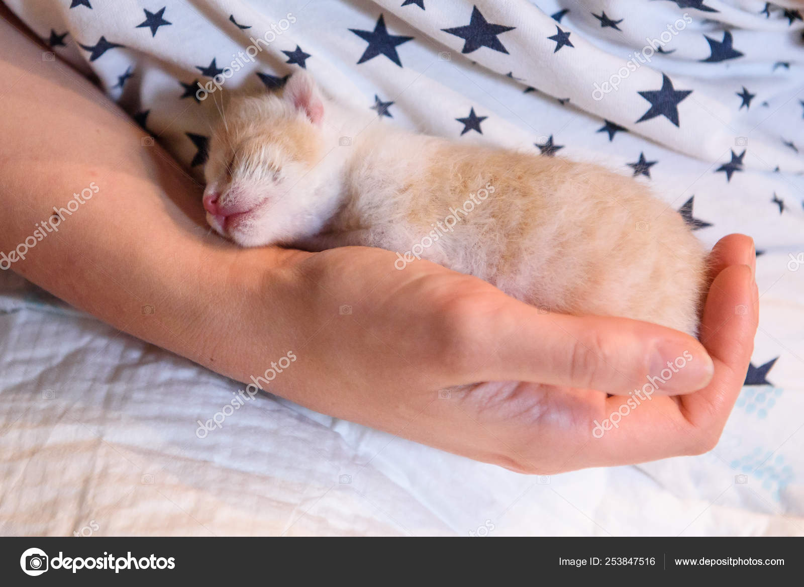Newborn Kitten Sleeping Person Holding Hands Stock Photo
