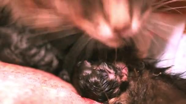 Mother Maine Coon Cat Licks Wet Newborn Kitten