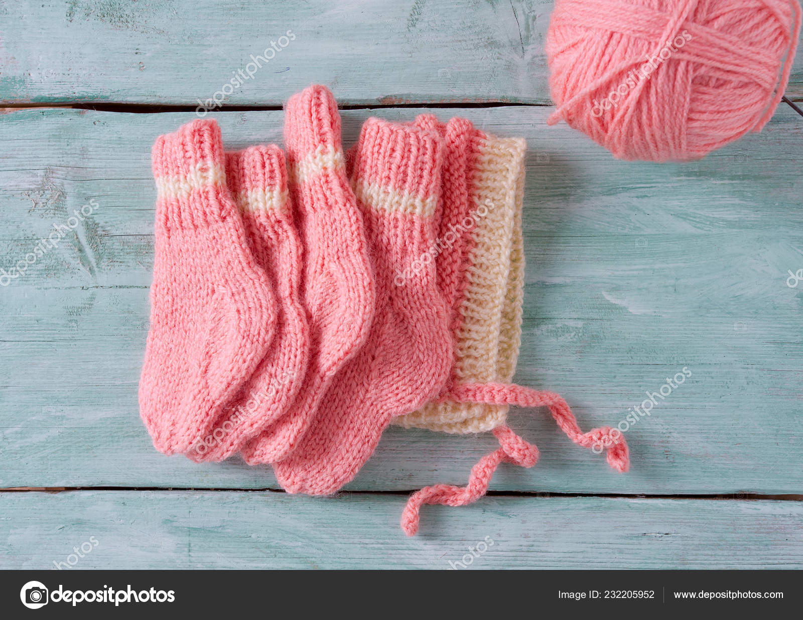 Knitted Clothes Newborn Baby Girl Wooden Surface Stock