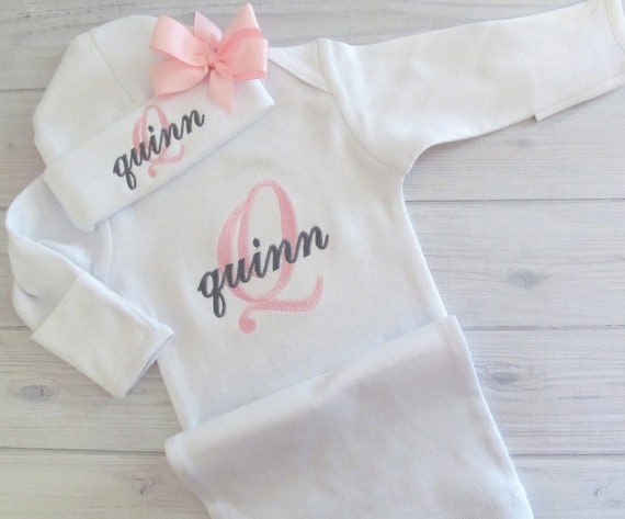 Baby Girl Coming Home Outfit Gown Mitten Cuffs Hat Bow Personalized Embroidered Monogram Newborn Girl Gift Clothing Baby Shower Gift