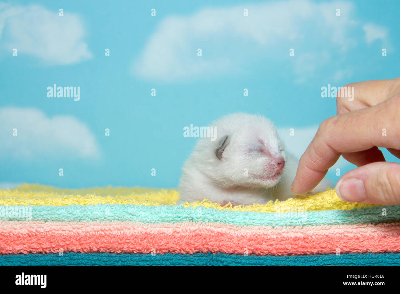 Newborn White Kitten Eyes Closed Laying On Yellow Aqua