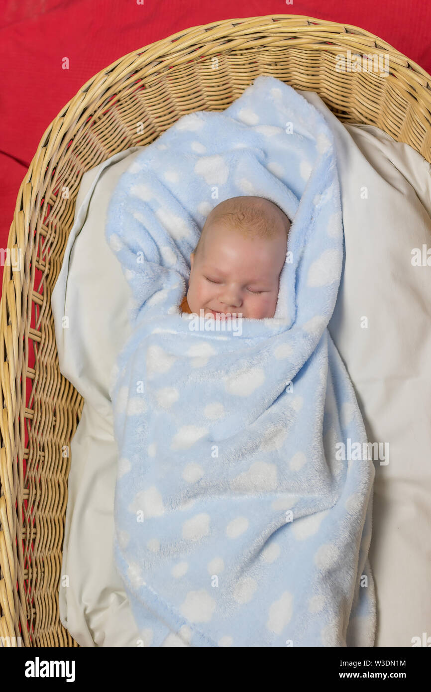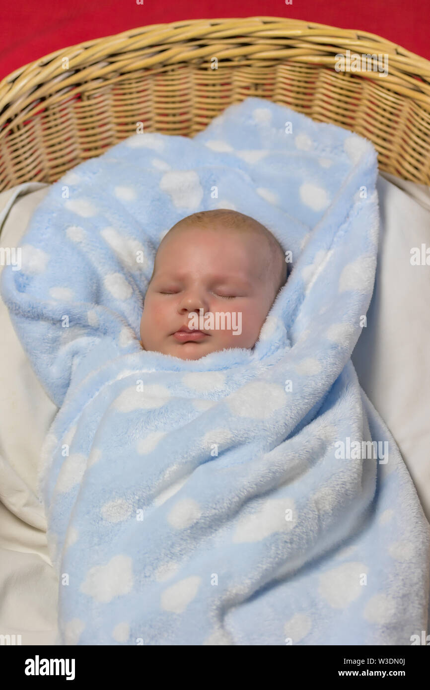 Top View Of Beautiful Newborn Boy Sleeping In Knit Basket