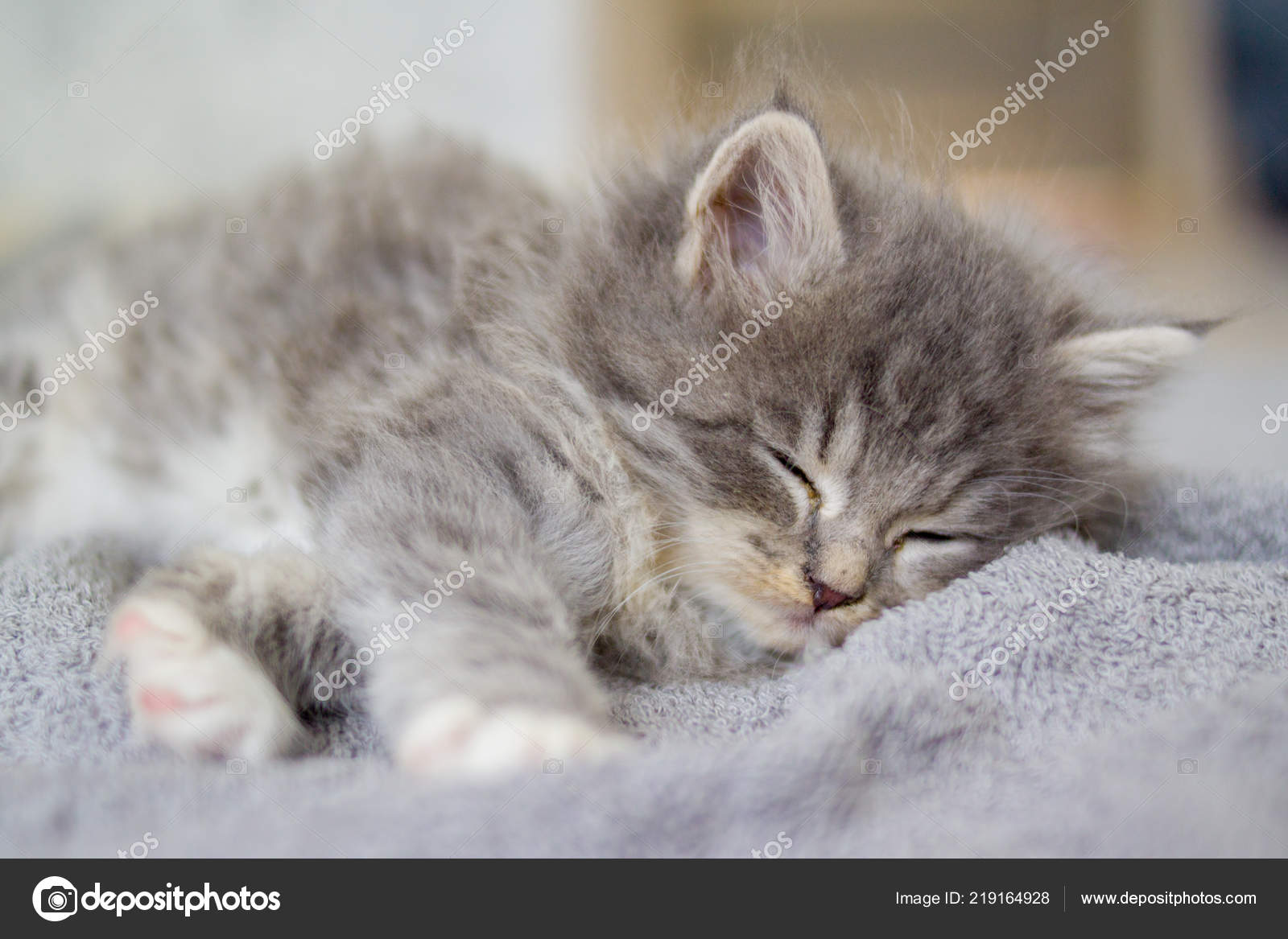 Little Fluffy Grey Persian Maine Coon Kitten Lies Sleeps