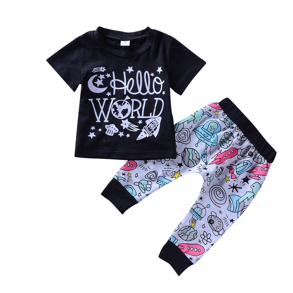 Cute Baby Boys Clothes Outfits Hello World Alien Rocket Planet Pattern Black Top Pants 2 Piece Set Kid Boy Toddler Summer Boutique Clothing