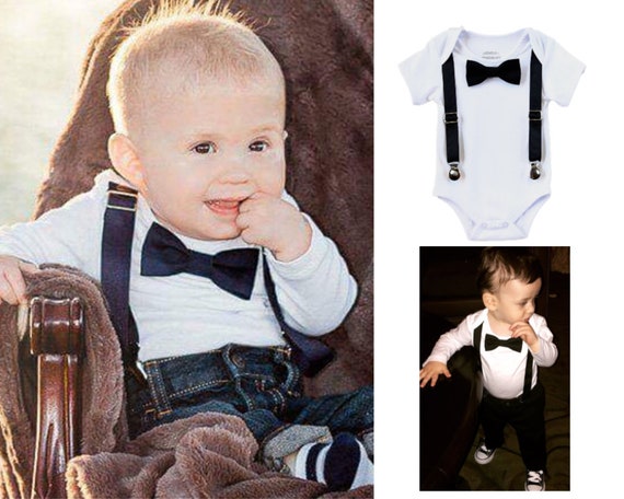 Baby Boy Formal Tuxedo Outfit Black Bow Tie Black Suspenders Newborn Boy Dressy Clothes For Wedding Church Cute Tux Fancy Outfit