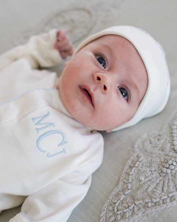 Baby Boy Coming Home Outfit Newborn Baby Boy Outfit Pima Cotton Baby Baby Boy Clothes Converter Gown Cream With Blue Trim Coming Home Outfit
