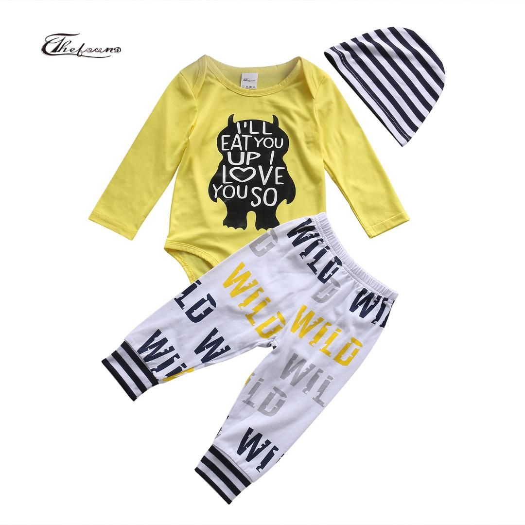Hot Fancy 3pcs Yellow Letter Monster Newborn Baby Boys Clothes Set Top Romper Long Pants Hat Outfits