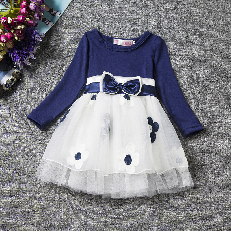 Infant Children Baby Girls Clothes Princess Bow Flower Printed Bow Long Sleeve Party Tulle Tutu Dress Navy Blue