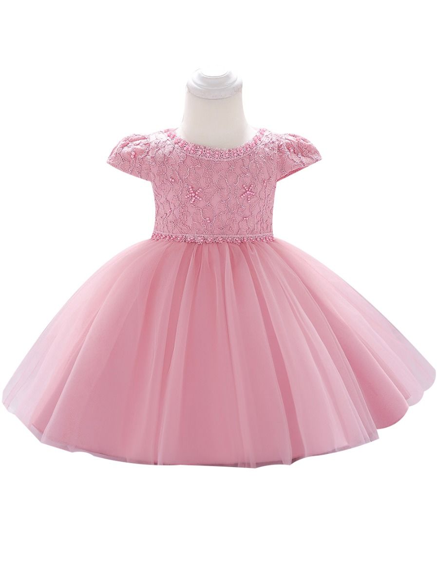 Fancy Solid Color Beaded Mesh Baby Girl Princess Dress Infant Bow Party Dress
