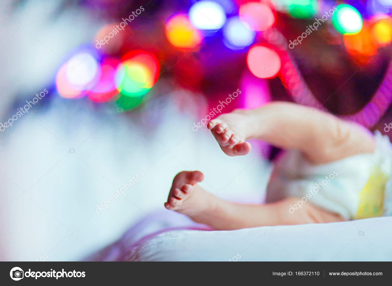 Newborn Baby Feet And Diaper With Christmas Tree And