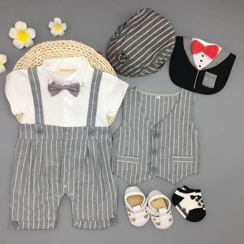 Infant Newborn Baby Boys Clothing Wedding Birthday Tuxedo Cotton Vest Bodysuit Hat Bib Socks Shoes Baby Christening Suit Outfits
