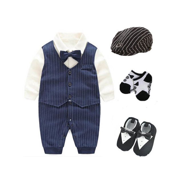 2019 Newborn Baby Boys Wedding Party Tuxedo Suit 0 18 Months Baby Bodysuit Hat Socks Shoes Outfits Set Gentleman Baby Shower Gift J190525 From