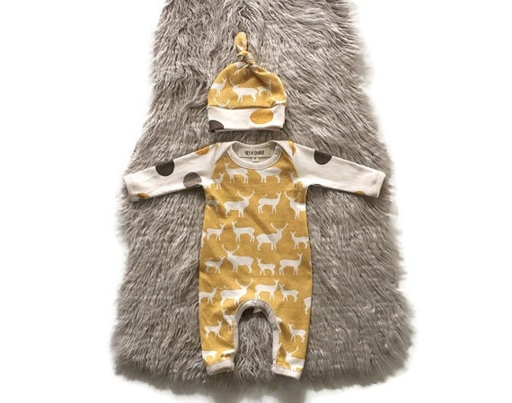 Newborn Boy Coming Home Outfit Organic Baby Clothes Hipster Baby Clothes Baby Boy Deer Romper Yellow Deer Polka Dots One Piece Hat