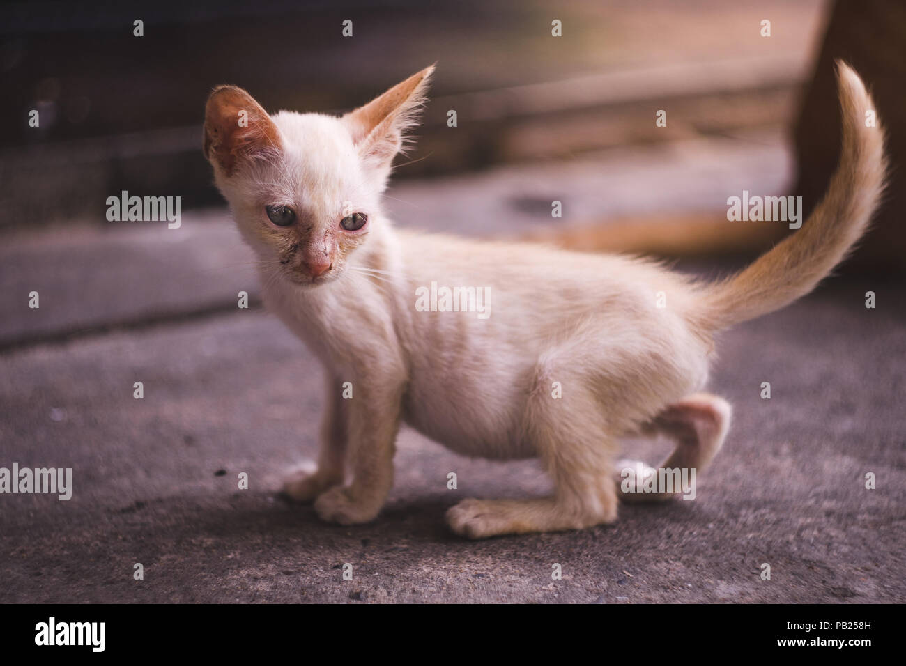 Close Up Full Body Of Little Dirty Skinny White Kitten Stock