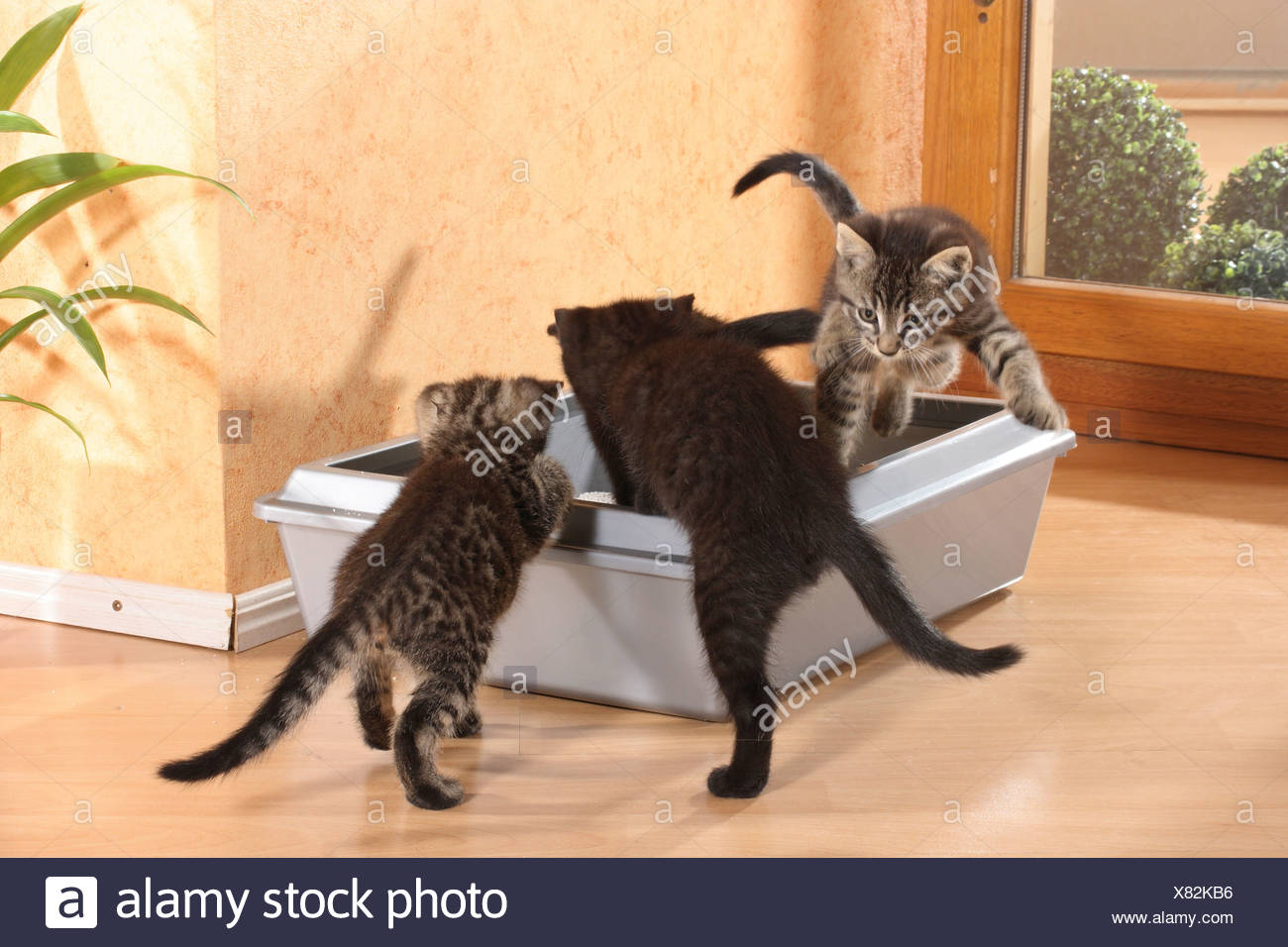 Domestic Cat Three Kittens At Cat S Litter Box Stock Photo