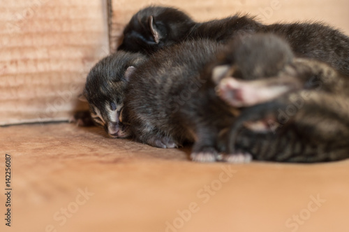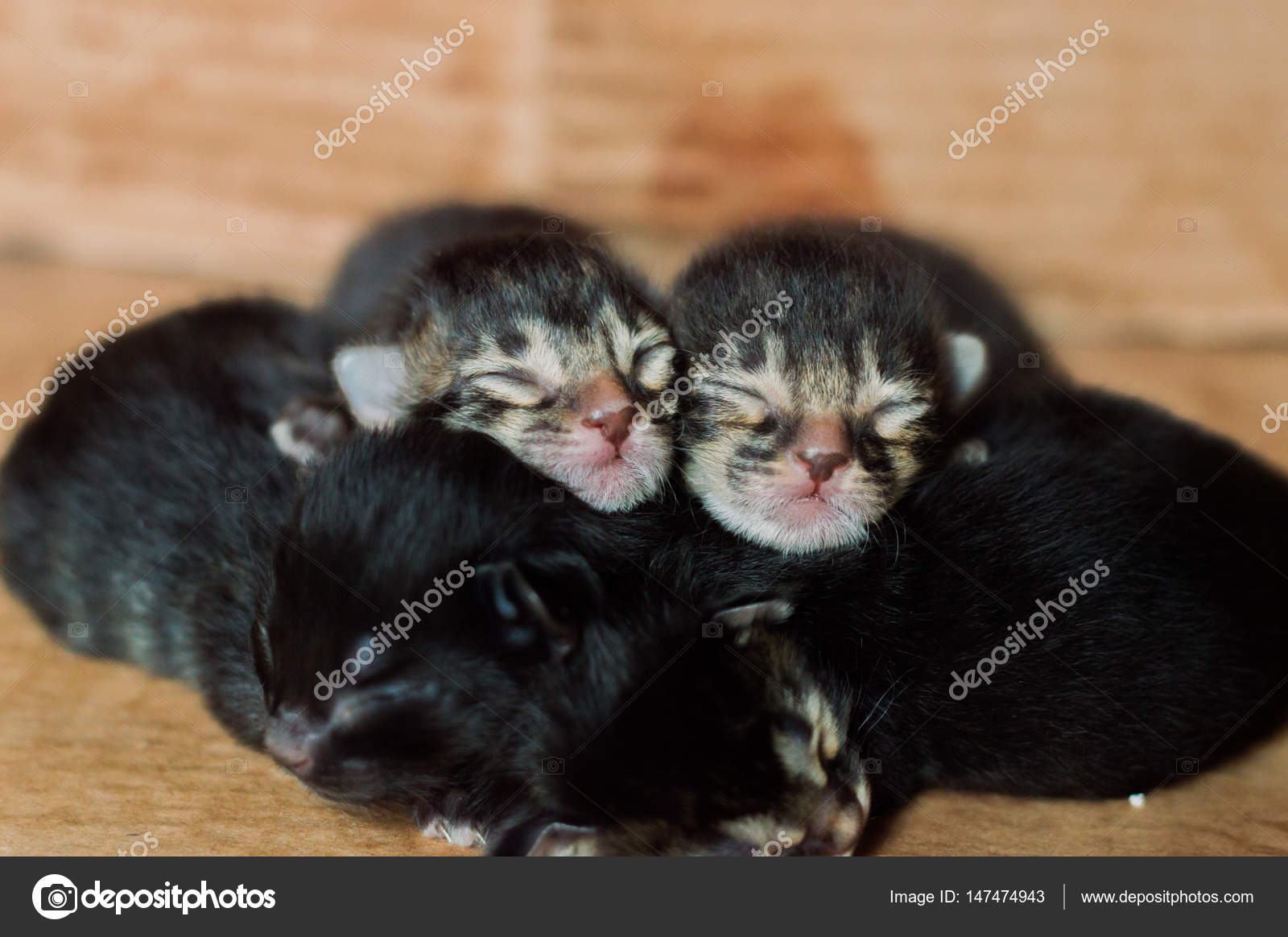 Little Blind Newborn Kittens Sleeping In A Cardboard Box
