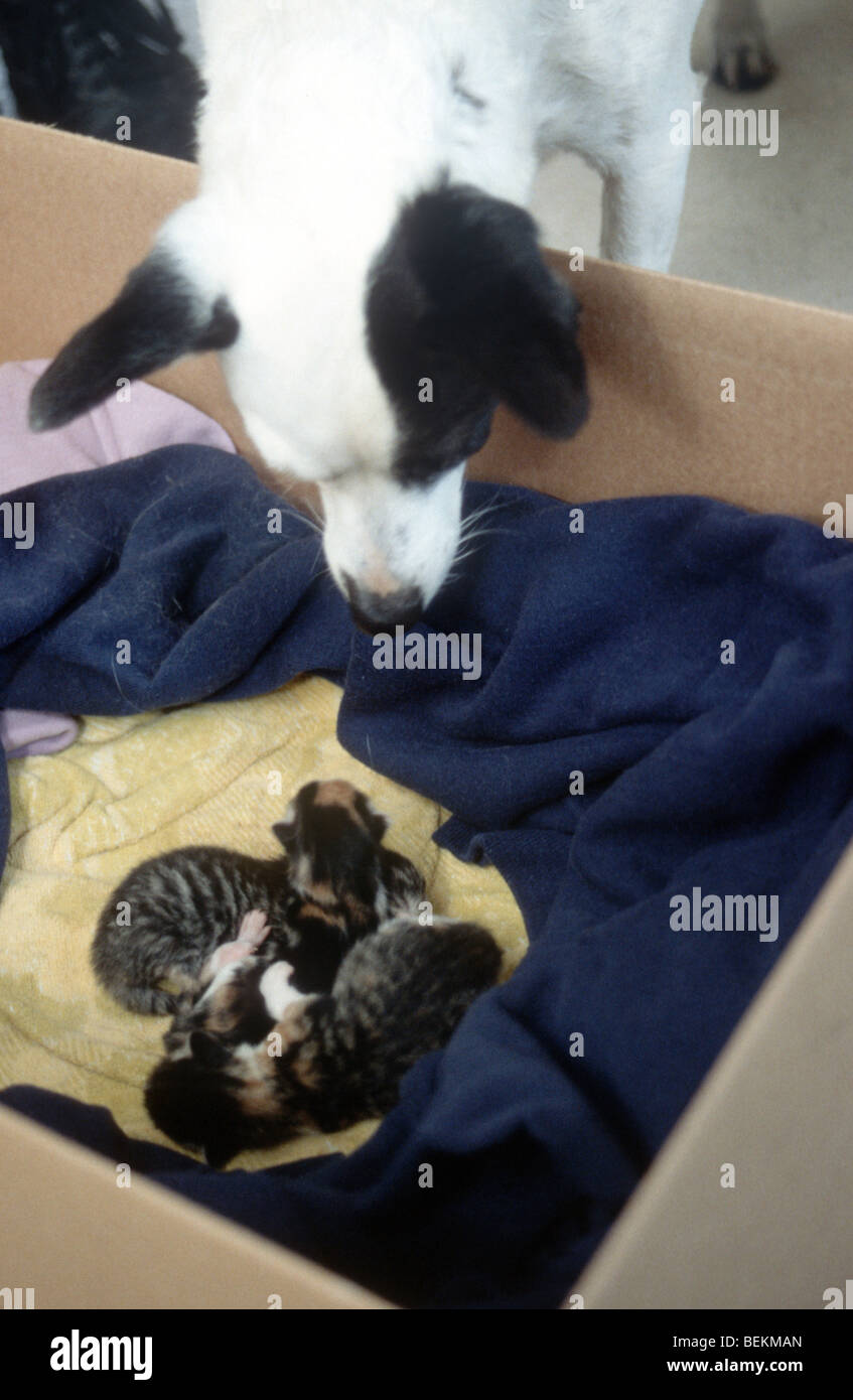 Dog Curious Sniffing At Newborn Kittens In Box Stock Photo