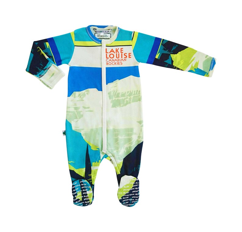 Baby Footie Lake Louise Ski Canada Footed Sleeper Layette Organic Cotton Baby Shower Gender Reveal Newborn Toddler New Mom Gift