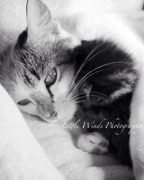 Cat Photo Momma Snuggles Kitten Black And White Photography Sleeping Baby B W Art For The Nursery Home Or Office
