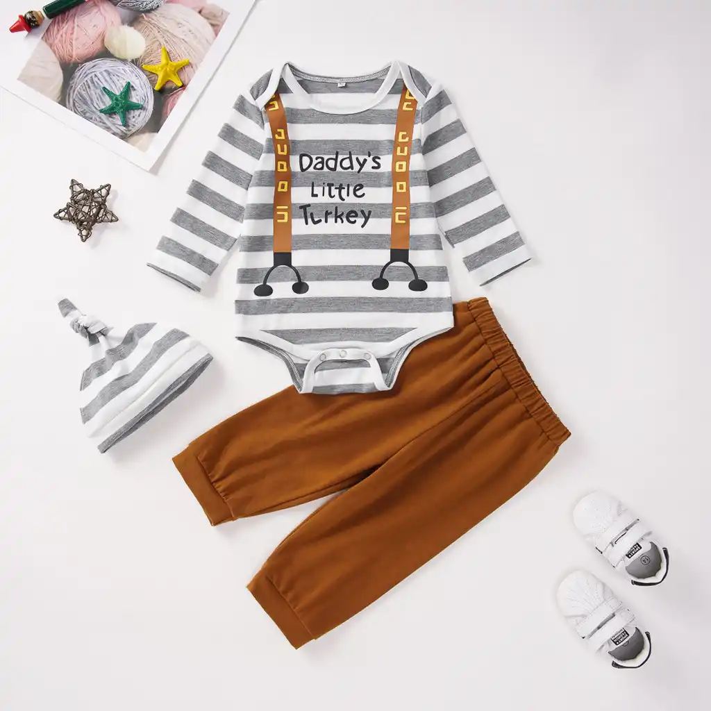 Kids Winter Clothes Newborn Infant Baby Boys Long Sleeve Letter Print Stripe Romper Pant Hat Outfit Infantil Boys Cotton Wear