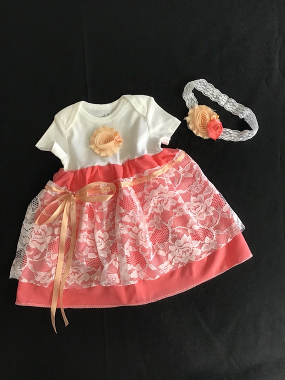 2 Pieces Size 0 3 Months White Peach And Coral Newborn Baby Girl Going Home Lace Baby Dress