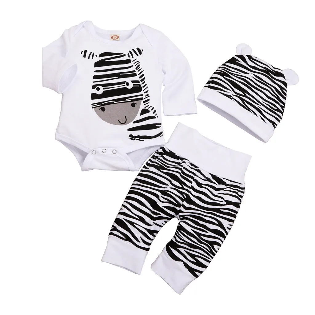 2019 Cute Newborn Baby Boy Clothes Infant Clothing Set Zebra Print Romper Pants Hat Toddler Boys Clothing Set Winter Baby Outfit From Jianghongfeng