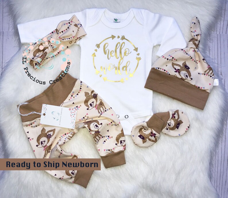 Ready To Ship Baby Girl Outfit Newborn Baby Girl Clothes Coming Home Outfit Hello World Glitter Deer Mitts Baby Shower Gift