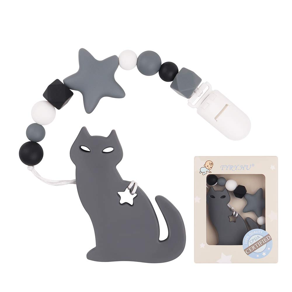 Pacifier Clip With Cat Teether For Boys Tyry Hu Binki Holder Teething Teether Toys Bpa Free Silicone Beads For Baby Birthday Shower Gift Set Grey