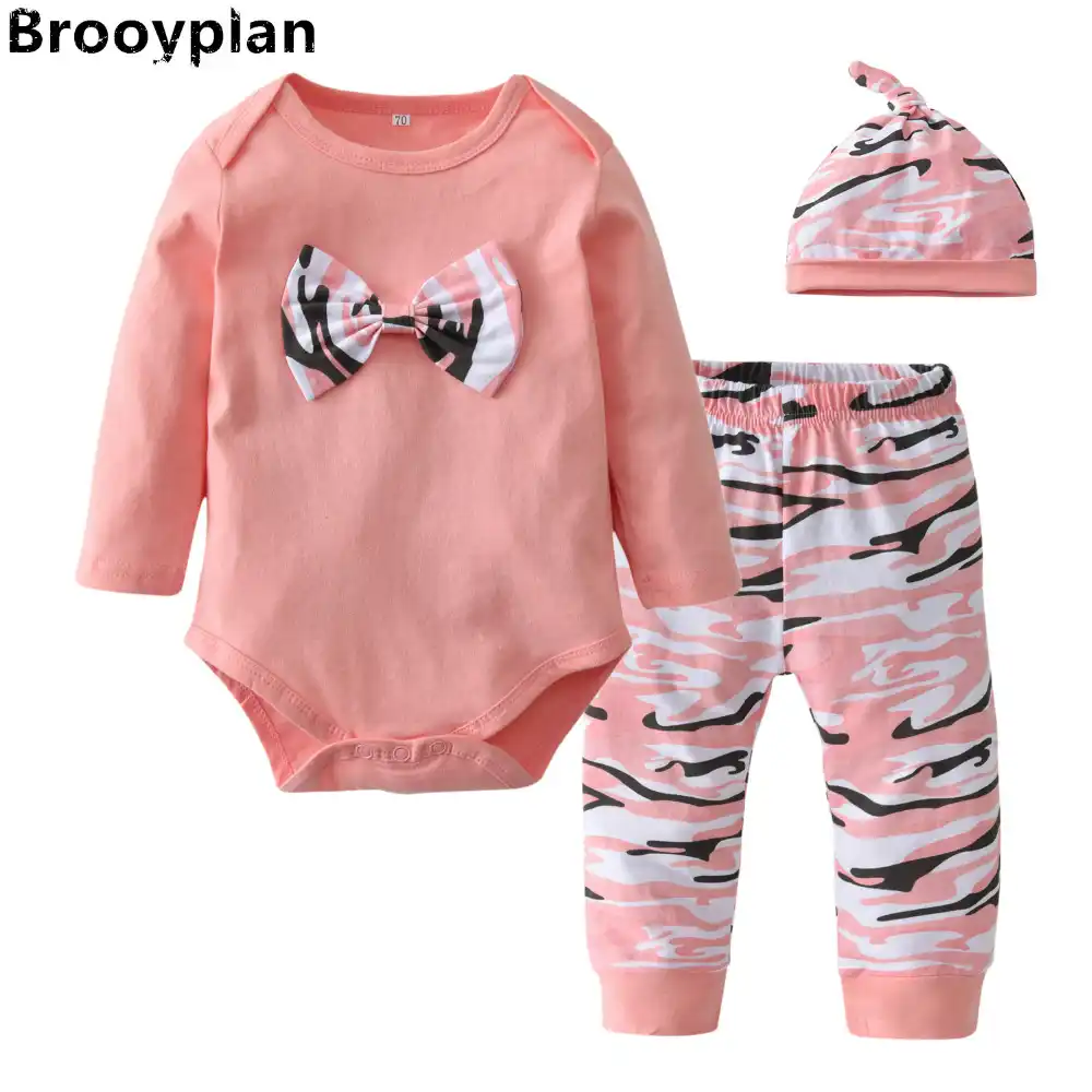 3pcs Newborn Baby Girls Clothes Long Sleeve Pink Camouflage Bow Romper Pants Hat Infant Baby Girls Clothing Set Toddler Outfits